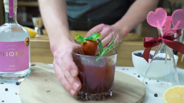 A dramatic smoky note from a burning sprig of rosemary sets the stage for a passionate and romantic flavor experience – perfect to share on Valentine’s Day. The botanical complexity of the gin combines with fresh strawberries and blackberries, muddled into a juicy base. Fresh lemon juice and honey syrup provide a classic sweet-tart balance, while balsamic vinegar adds a cheeky edge that makes the cocktail unforgettable.